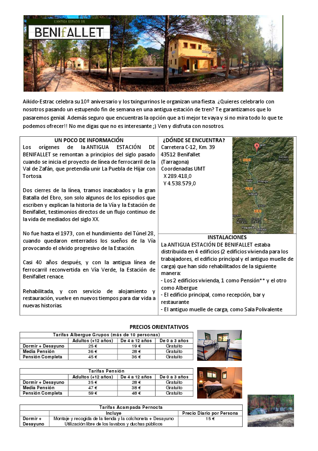 Esta es la salida/celebración estrella de este año. Queremos organizar un fin de semana en la antigua estación de Benifallet (Tarragona) situada en una via verde donde tendremos la oportunidad de compartir buenos momentos juntos y realizar diferentes actividades para los que quieran, desde visitas turísticas, a rutas en bici o pasarse el día en una tumbona con una cervecita fresquita en la mano :) Habrá para todos los gustos. Eso sí, esta, al ser de fin de semana es más costosa de organizar así que tardaremos un poquito más en tenerlo preparado. Además, como veréis en el "folleto" que ponemos a continuación, hay diferentes posibilidades de alojamiento y pensión. Pero bueno todo esto lo iremos detallando cuando llegue el momento.